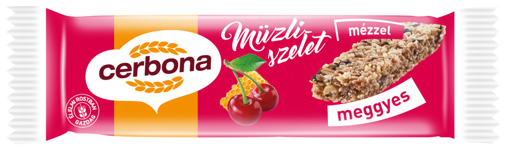 A Cerbona Meggyes müzliszeletet többfajta gabonapehely, méz, meggy és csokoládé darabok teszik igazán ellenállhatatlanná. Különös gondossággal olyan alapanyagokból állították össze, hogy a szervezetet értékes élelmi rostokkal lássa el.