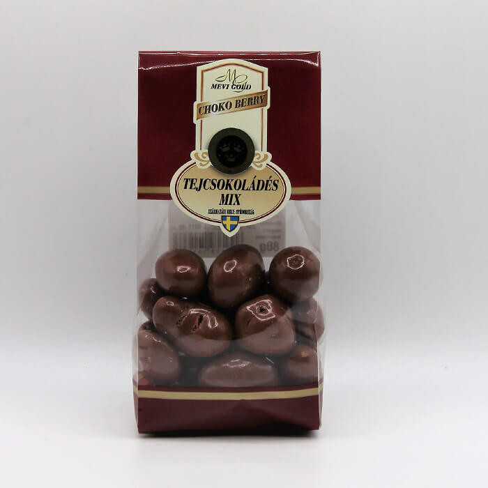 Tejcsokoládéval bevont: kesudió, mandula, banán, mazsola, puffasztott kukorica, paradió vagy török mogyoró mix