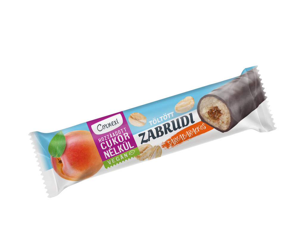 Henger alakú, töltött zabszelet, teljesen bevont. Színe bézs-drapp, sárga töltelékkel a közepén, barna kakaós bevonóval. Illat: kellemes sárgabarackos, idegen illattól mentes Íz: édeskés, sárgabarackos, idegen íztől mentes Állomány: tömör,nem széteső.