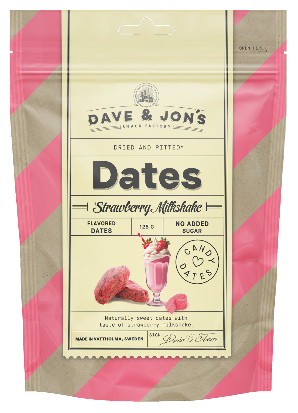Dave & Jon's dates strawberry milkshake mag nélküli ízesített datolya epres shake ízben, hozzáadott cukor nélkül 125 g