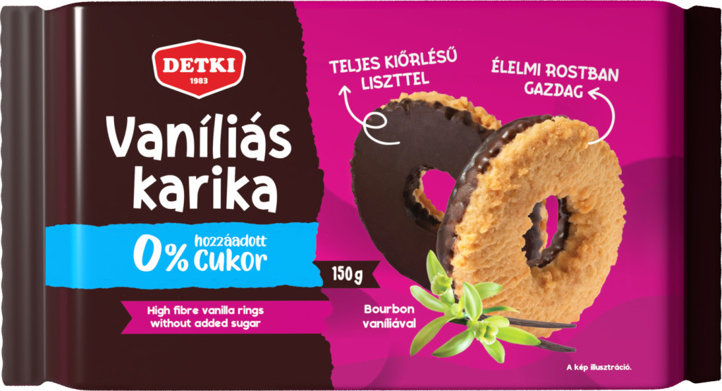 0% hozzáadott cukor, teljes kiőrlésű liszttel, élelmi rostban gazdag, Bourbon vaníliával, természetes módon előforduló cukrokat tartalmaz.