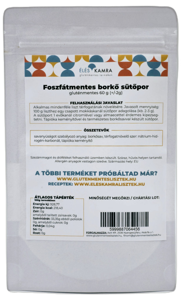 A természetes borkősavat tartalmazó sütőpor nem tartalmaz foszfátokat, amelyek a szervezetünkre kedvezőtlen hatást gyakorolhatnak (pl. kivonják a vitaminokat, ásványi anyagokat) és kukoricakeményítőt sem használtunk. Kiadósabb a felhasználása, kevesebb is elegendő a megszokott sütőporhoz képest, hiszen csak annyi tápióka keményítőt adtunk hozzá, mely az aktív hatóanyagokat egyenletesen elegyíti.