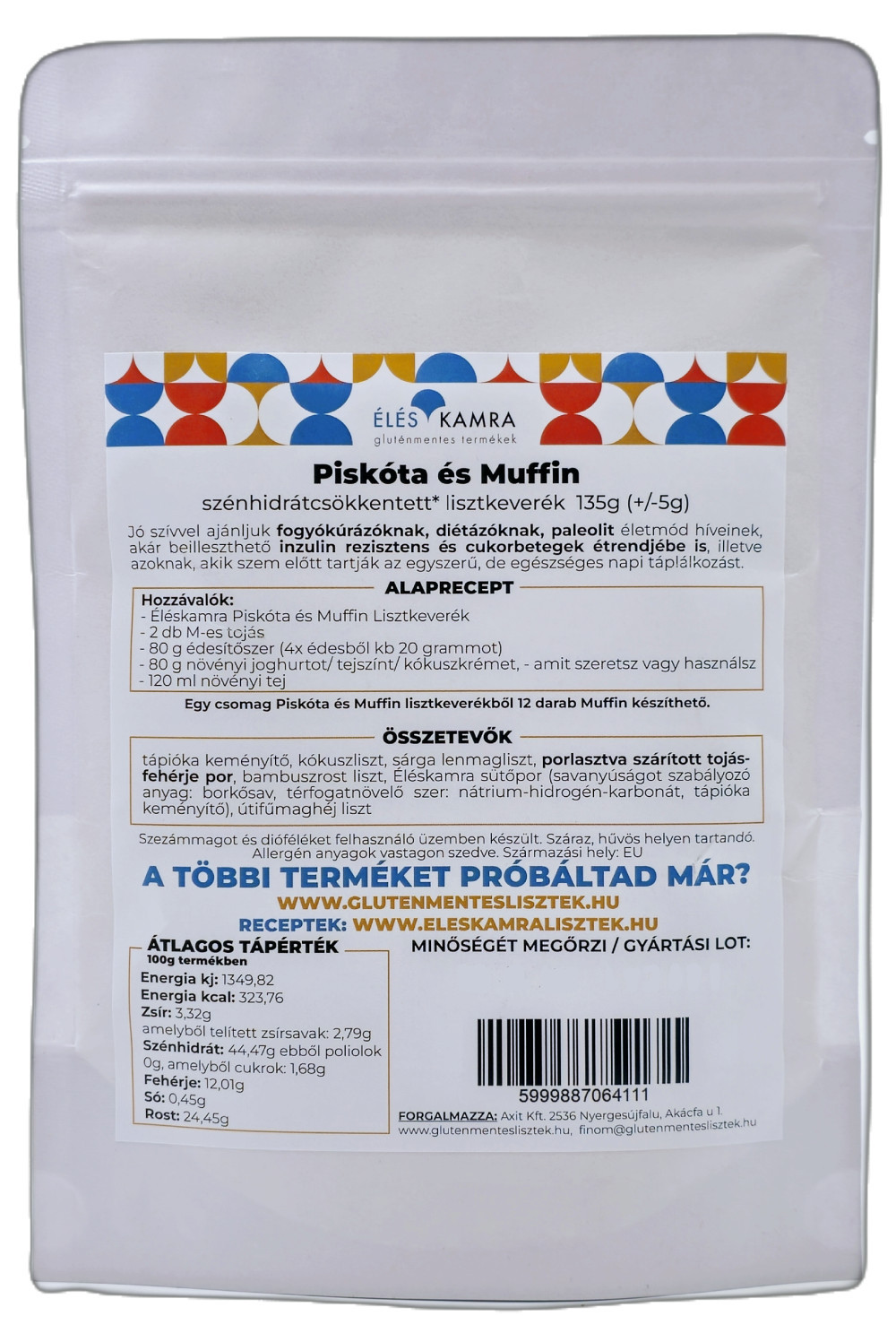 Összetevők: tápióka keményítő, kókuszliszt, porlasztva szárított tojásfehérje por, bambuszrost liszt, Éléskamra sütőpor (savanyúságot szabályozó anyag: borkősav, térfogatnövelő szer: nátrium-hidrogén-karbonát, tápióka keményítő), útifűmaghéj liszt, arany lenmagliszt