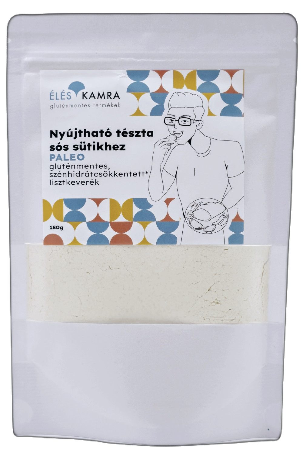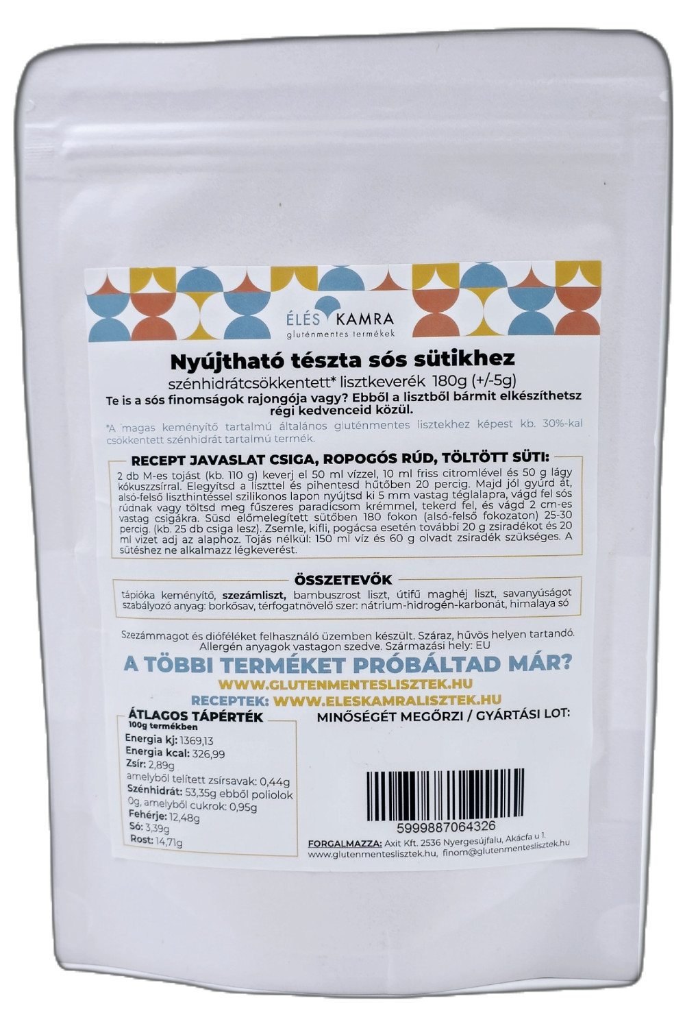 Összetevők: tápióka keményítő, szezámliszt, bambuszrost liszt, útifűmaghéj liszt, Paleolit Éléskamra sütőpor (savanyúságot szabályozó anyag: borkősav, térfogatnövelő szer: nátrium-hidrogén-karbonát, tápióka keményítő), himalaya só.