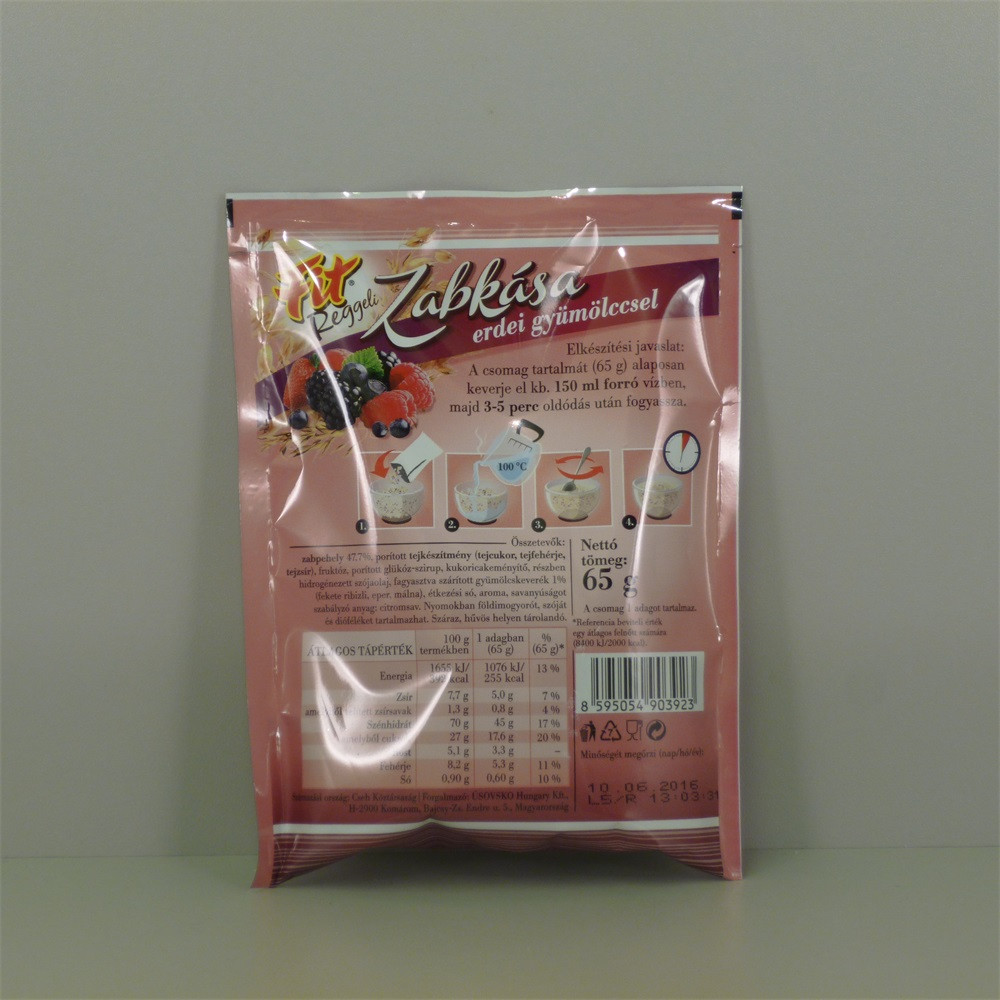 Összetevők: zabpehely 47,7%, porított tejkészítmény (tejcukor, tejfehérje, tejzsír), fruktóz, porított glükóz-szirup, kukoricakeményítő, részben hidrogénezett szójaolaj, fagyasztva szárított gyümölcskeverék 1% (fekete ribizli, eper, málna), étkezési só, aroma, savanyúságot szabályozó anyag: citromsav. Nyomokban földimogyorót, szóját és dióféléket tartalmazhat.