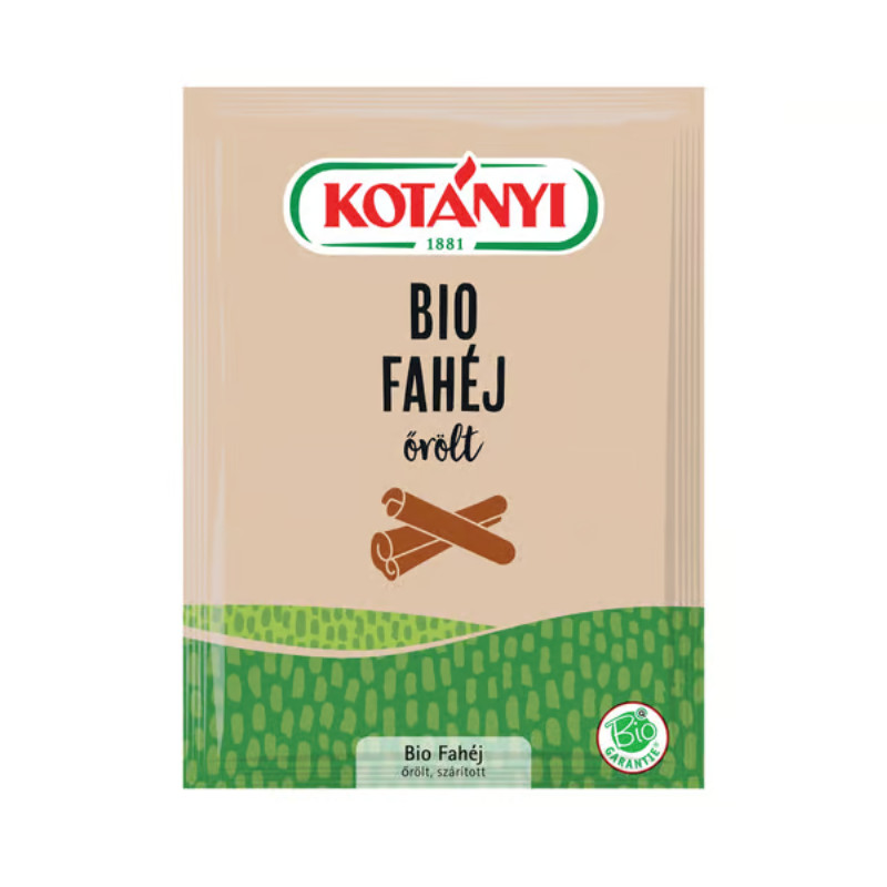 "A KOTÁNYI Bio fűszerek válogatott mezőgazdasági régiókból és ellenőrzés alatt álló ökológiai gazdálkodásokból származnak. Így tökéletesen kifejezésre jutnak a fűszerek eredeti illat- és ízharmóniái és garantálják a természet igazi ízét. Az államilag is elismert ""Austria Bio Garantie"" és Biokontroll Hungária Kht. tanúsítványai (HU-ÖKO-01) garantálják a folyamatosan ellenőrzött ökológiai minőséget. A fahéj nagyszerűen illik édességekhez, desszertekhez, karácsonyi süteményekhez és forró italokhoz. A termék gluténtartalmú gabonaféléket, tojást, tejet (laktóz), zellert, szóját, mustárt és szezámmagot is felhasználó gyártóüzemben készült. Száraz helyen tartandó. Tápértéktartalom