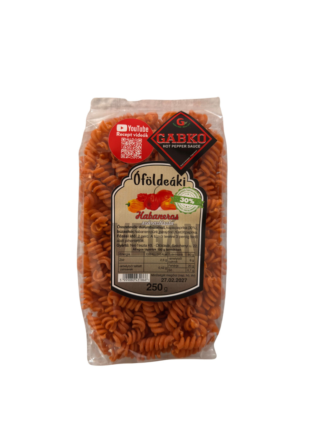 Összetevők: durumbúzaliszt, kápia paprika, búzasikér, habanero püré, parajdi só, füstölt paprika