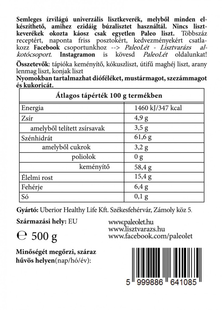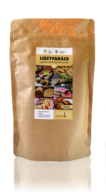 Összetevők: tápiókakeményítő, kókuszliszt, útifűmaghéjliszt, aranylenmagliszt, konjak liszt.